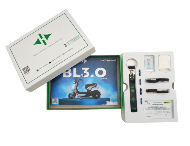 BEAM 3.O is a smart electric scooter designed for modern urban travel, delivering a range of over 70 km on a single charge. With app connectivity, NFC-based access, and IP67-rated components, it offers seamless control and all-weather reliability. Its 250W motor, telescopic suspension, and disc brakes ensure a smooth, safe, and comfortable ride. The scooter supports onboard and home charging, features dual seating with storage, and includes a polychrome digital cluster for real-time insights. Backed by a 3-year warranty and low running costs, BEAM 3.O combines efficiency, technology, and sustainability in one stylish ride.